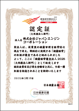 株式会社ジャパンエンジンコーポレーションは、経済産業省と日本健康会議が進める健康経営優良法人認定制度において、「健康経営優良法人2025(大規模法人部門)」に認定されました。