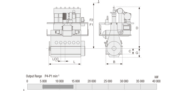 L: Minimum length of engine LCC: Distance between cylinder centers B: Bedplate width at foot flange C: Crankshaft to underside of foot flange D: Engine height from crankshaft center G: Distance from bedplate bottom to crankshaft center F1: Piston overhaul height with standard tool F2: Piston overhaul height with special tool